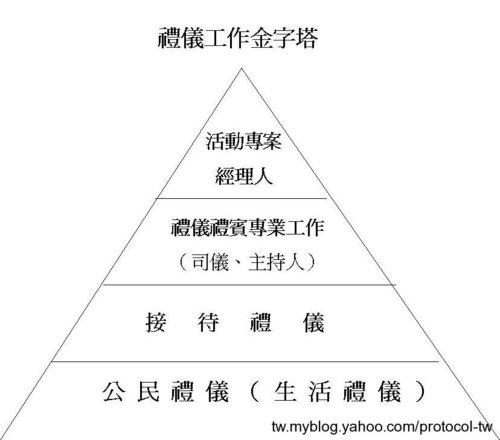 有關「禮賓人員」行業,個人認為應該採廣義解釋,例如:公共關係工作、外交人員、活動籌辦、秘書實務等等的從業人員,禮儀工作其實層面廣泛而且還需有相當的專業深度,這就是「禮儀工作金字塔」: