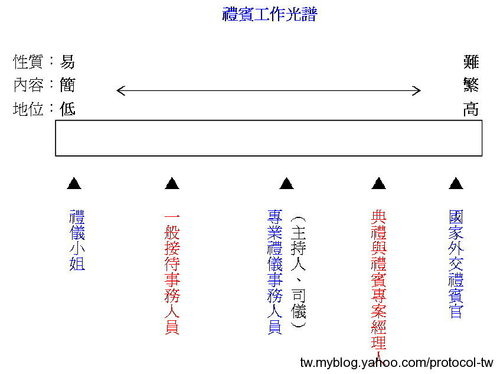 上圖所要表達的,是職場上從下而上、由簡到難、由「一般事務」到「專業禮賓相關工作」。我認為學術上有屬於跨領域的「禮儀學」,而實務上對「禮儀學」的實踐,就是各種階層與專業難易上各種的「禮賓工作人員」,再對「禮賓工作」分析,請看「禮賓工作光譜」圖示: