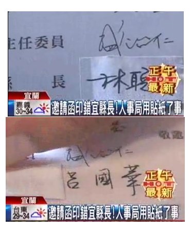 說是沒校對,這才產生錯誤,等到發現印錯人,負責作業的人員又為了節省成本,選擇貼紙直接覆蓋上去,只是這樣子的做事態度,似乎有欠周全。縣長林聰賢:「建議中央在這個環節上,應該要更細心一點,疏忽了,那改正過來就可以了。」