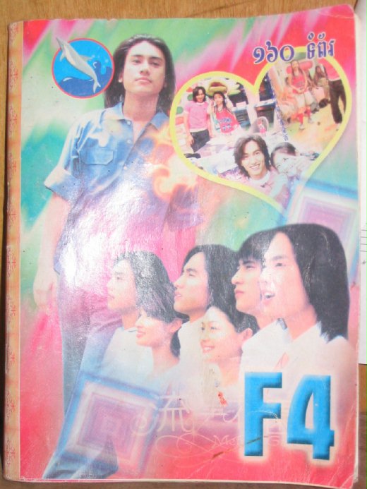 這張照片是6月中去柬埔寨玩,到當地的民俗工藝學校參觀,赫然發現學員桌上放著F4筆記本,仔細一看,封面的字可是柬埔寨文喔~~(也或許是泰文啦,反正對我來說都是蝌蚪文XD)。雖然我只喜歡日本藝人,平常對台灣出產的「偶像」沒啥好感,但看到外國人喜歡咱們國家的藝人,還是覺得蠻屌的。