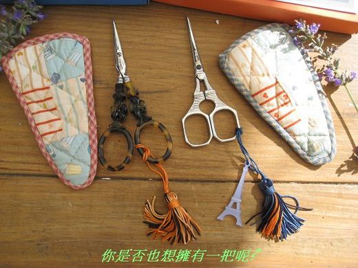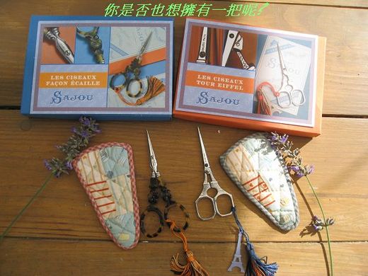 這是一家讓人有許多驚奇的店,他們有許多日本書上的雜貨,歐洲進口布,材料包,美國風的古物,還有拼布用的剪刀,那天她們剛好進了許多客戶訂的剪刀,據她說這家公司可不是隨便讓店來經銷他們的產品的.因女孩的喜愛,而結識了公司的頭頭,她還收藏許多他們的剪刀,就在她的廚窗裡,只是它的價位非常高,對於拼布沒什麼興趣的我並沒什麼意願買,但是女孩說這剪刀是會升值的,聽得老公心動的直鼓吹我買,每次買東西我都不是很想買,但是老公總會鼓吹我買,不明事理的人都說你老公真是太好了,但經我這些時間前前後後的思考,應該是老公有購物狂,這次在老公鼓吹下,我只好說順水推舟買一把,但老公卻說買二把好了,其實我是捨不得買,但出錢的說了就算了,就二把.吧,其實我很清楚老公是想收藏,而我是比較實際,買了就要用,不用豈不是太浪費了.
