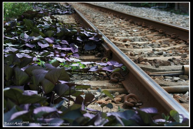 菜葉是這樣的悠遊自在,恣意蔓延在鐵道邊邊,火車天天駛過,葉子也知道不該去跨越那危險界線。