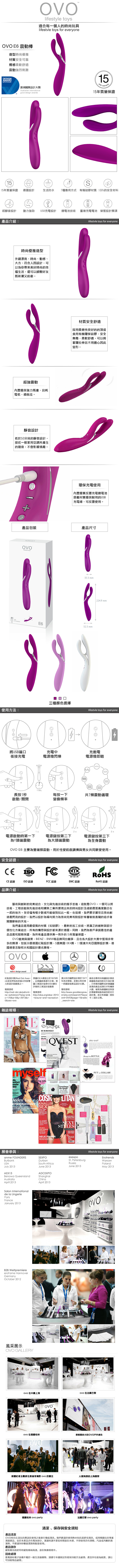 | |OVO E6 震動棒|||造型時尚優雅|||材質可靠安全|||觸感柔軟舒適|||震動強烈刺激|||7頻震動模式|||榮獲澳洲國際設計大獎||||||外觀漂亮、時尚、動感、|||大方、符合人因設計,可以為你帶來美好時尚的性福生活,還可以饋贈好友既新潮又前衛。|||採用柔嫩性良好的的頂級|||食用有機環保硅膠,安全|||無毒,柔軟舒適。|||內置優良強力馬達,且耗|||電低,續航佳。|||低於50分貝的靜音設計,|||接近一般家用空調所產生|||的聲音,不會影響情趣。|||內置優質反覆充電鋰電池|||搭載材質優良耐用的USB|||充電線,可反覆使用。|||