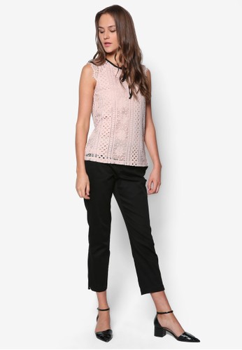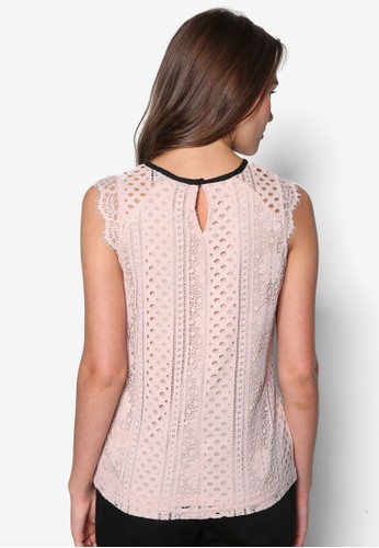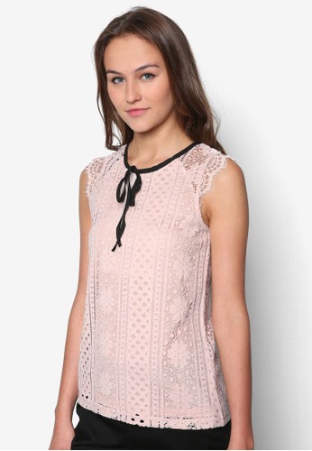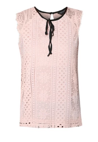 Dorothy Perkins 的撞色繫帶蕾絲上衣,溫柔浪漫的蕾絲設計,配以撞色繫帶圓領,設計甜美百搭。 - 纖維膠混紡 - 圓領 - 無袖 - 鈕扣開襟設計 - 寬鬆裁剪 - 局部內襯