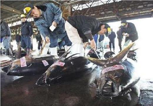 2、日本宮城縣鹽釜港的魚市場內於四月四檢視捕獲的鮪魚,準備拍賣;這是自日本福島9級強震後當地魚市首次開張。