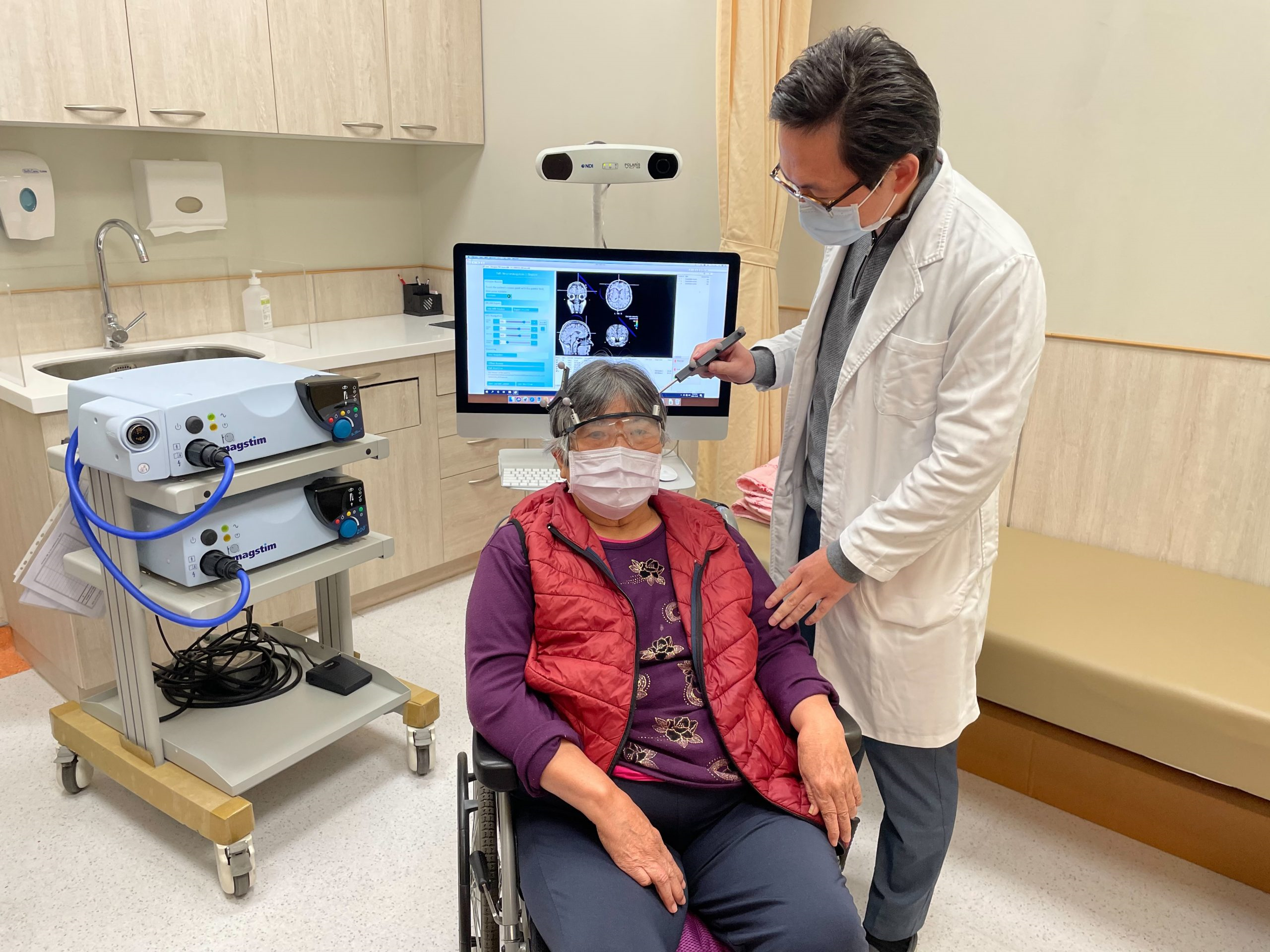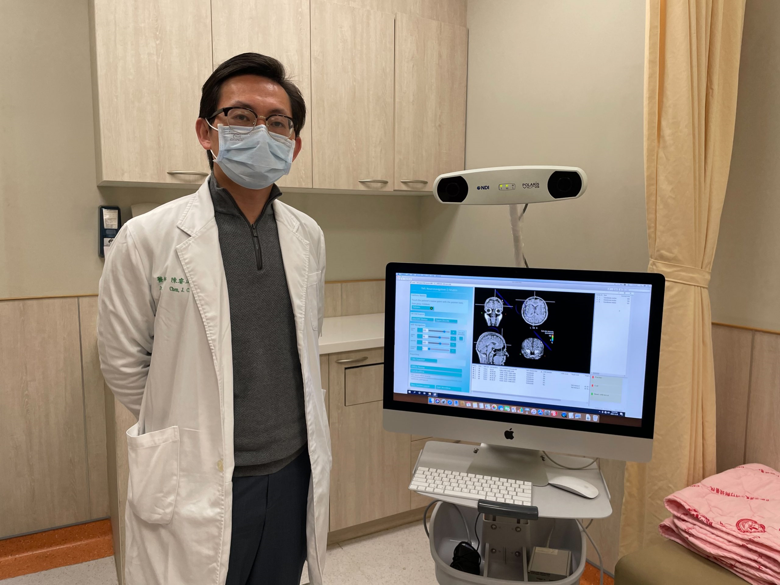 陳睿正主任強調,在施行經顱磁刺激治療,特別在腦部曾經受損,如中風或是腦傷,水腦,失智症的病人,腦部結構已與正常結構不同,傳統的定位方式所定位的位置,極大部分已與病患實際位置不同,利用3D立體導航定位,依據患者腦部影像進行定位,可以提供精準刺激與精準治療,因此針對腦中風病人特別重要。