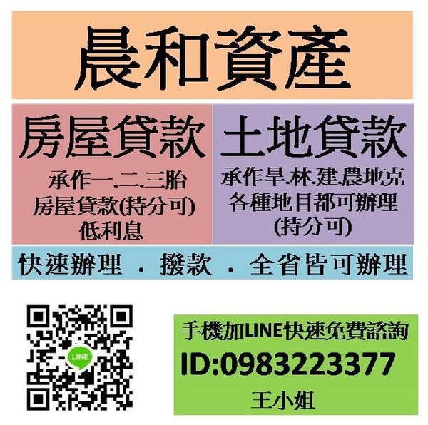絕對不是地下錢莊,絕對不是當鋪,是正派經營的公司,不收高手續費,低利息,無還款期限,當您資金運用有困難時可讓晨和資產來幫助您,加入LINE可更快免費諮詢ID:0983223377。