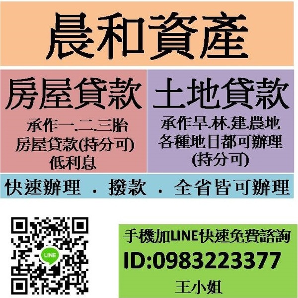 晨和資產通通都可為您辦理貸款,不收高手續費,低利息,無還款期限,當您資金運用有困難時可讓晨和資產來幫助您,加入LINE可更快免費諮詢ID:0983223377。