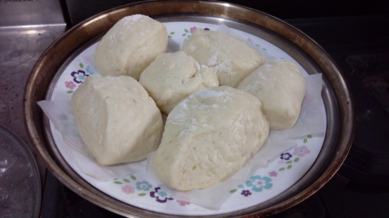 當天做了2次,第1次用600公克麵粉,水300公克(麵粉的一半),酵母粉,泡打粉各6公克(麵粉的百分之一),第二次作400公克,一公斤麵粉全用完。