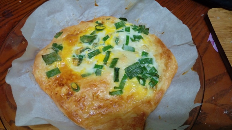 麵糰揉好後,先抹油再加青蔥末,然後加蛋,包得沒成功,蛋清流出麵皮外,就乾脆放盤子上,直接在烤箱烤(圖三)。色彩很漂亮,吃起來味道也還不錯(烤箱烤20分)算是「歪打正著」。