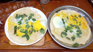 油抹在餅皮,撒蔥花,加一個蛋。圖二和三