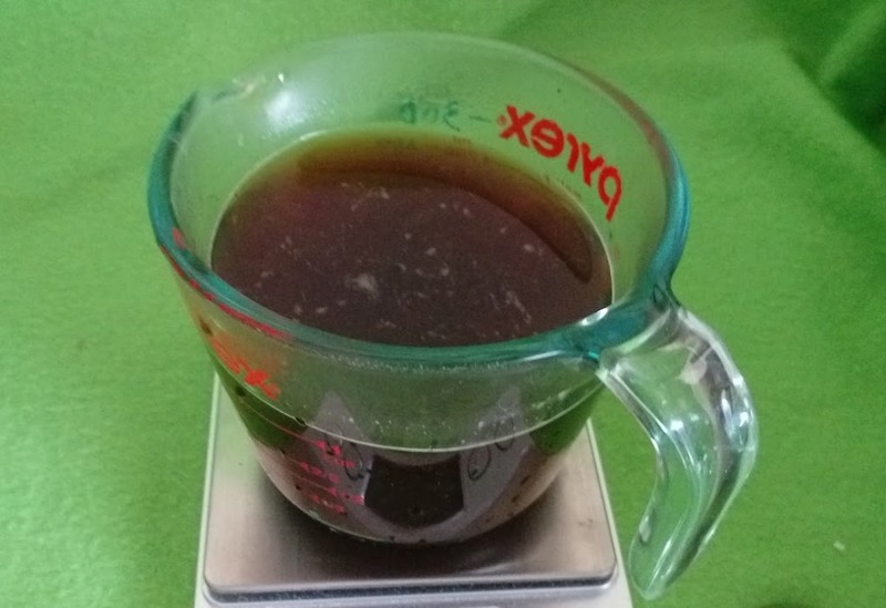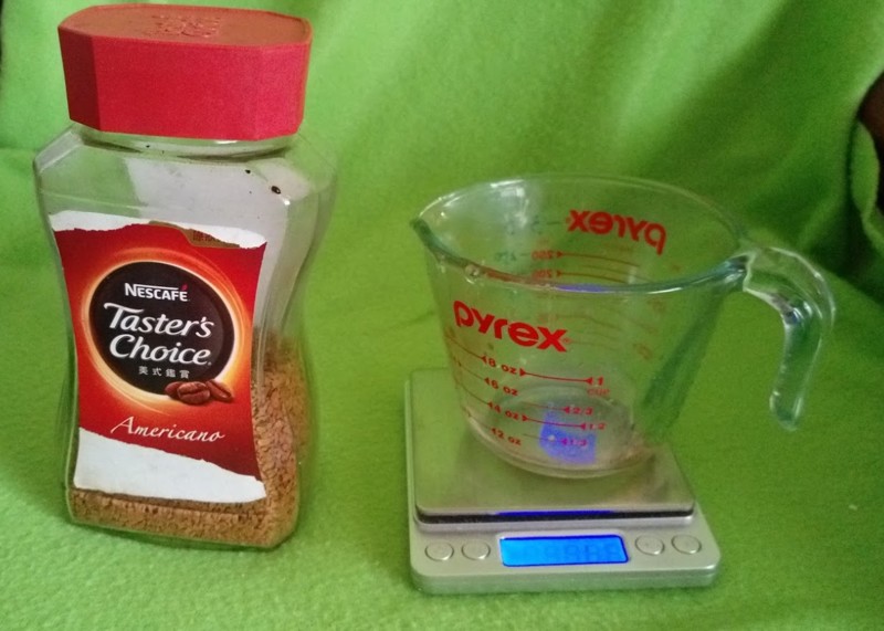 泡咖啡時我會用電子秤先秤康寧量杯的重量,再量咖啡的重量(圖上),如康寧量杯重量417公克,咖啡2.5公克,總重就是419.5公克。