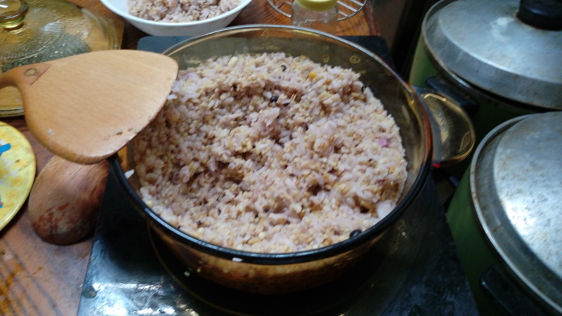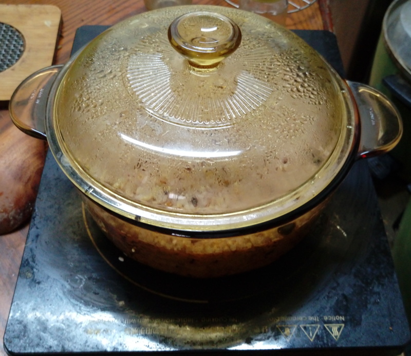 下圖:飯(多穀飯)已煮熟,康寧透明鍋下面是尚朋堂黑晶爐(可以定時)。