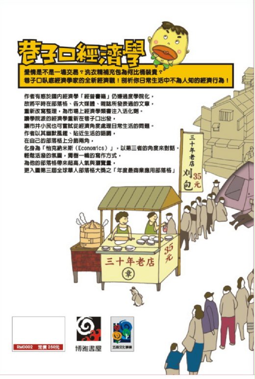 下午,出版社責任編輯傳來「巷子口經濟學」的封面,看到這種風格,馬上意外的大笑三聲,美編果然厲害,這下子,我可把學院派的經濟學給