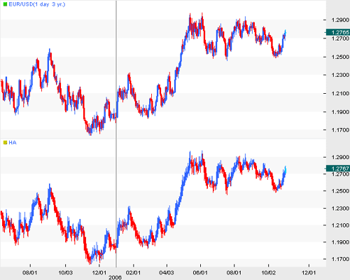Before we get into the actual application of the Heikin Ashi, let's dive into some logistics involving the real meaning behind it. Usually a type of candlestick chart, the Heikin Ashi is available on some charting packages as a separate indicator. This allows investors or speculators to make a side-to-side comparison between the standard candlestick and the Heikin Ashi, allowing for a more cohesive interpretation. In Figure 1, the chartist can see that the two are very similar but offer different perspectives, as the Heikin Ashi indicator disregards market noise and concentrates on the smoother trend of the underlying price action in the euro/U.S. dollar.