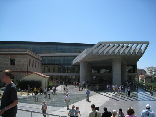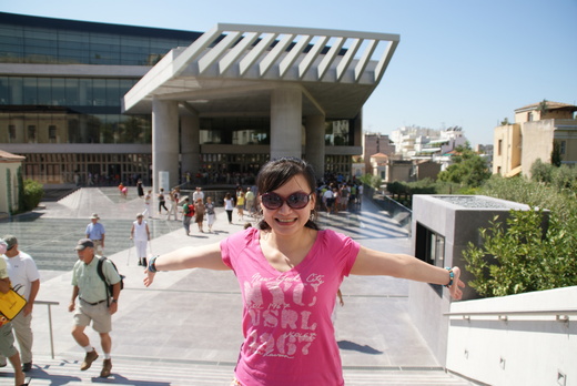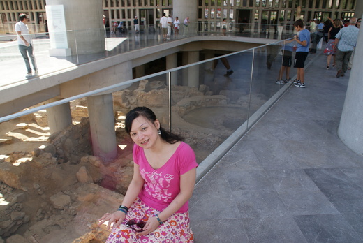 為什麼說是意外發現呢?因為當我們往衛城山丘南側往下走,經過這棟現代化的建築時,先是以為是一間大型的MALL,可是又見到有人在排隊,又認為可能是車站,但是車站哪有大排長龍到門口的,而我們手邊的三本旅遊書根本沒有介紹這個地方。我們循著階梯,走了下去,想要去弄清楚,這究竟是甚麼地方?結果才發現腳底下踩著的透明的強化玻璃,可以從上往下見到各式各樣的古蹟。我們跟著人群排隊,我先去問了門口的一個管理員,他說這是一座博物館,門票一歐元。博物館?這麼現代化?怎麼書上沒任何的資料。後來,我們問Peter,才知道那是雅典新的衛城博物館,在2009年6月底正式開幕,到今年年底門票都只要1歐元。想想我們還真是幸運啊!