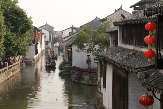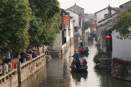 綠柳婆娑,碧水泱泱,伴著輕搖的小船,在呈「井」字型的河道上跳舞,呈現安謐幽靜的水相情趣。可惜觀光的發展,帶來太多的商家和人潮,把周庄披上了商業化的外衣。