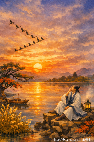 AI製圖 《七絕》暮天歸雁 破空人字正翩翩 矯首乘風映暮天 癡想歸心隨雁去 俗塵牽絆愧徒然 下平聲 一先