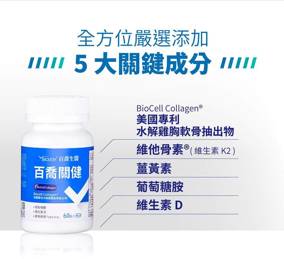 火紅開箱推薦【BioJoy百喬】關健_BioCell 二型膠原複合錠x5瓶(60錠-瓶)