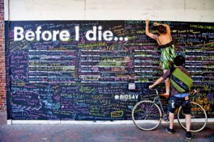 黑板上密密麻麻的留言,寫下的都是每個人在離開這個世界前的願望,一句簡單的填空題,卻引發人們深沉的思考,這是紐澳良藝術家Candy Chang,把住家旁一間廢棄屋的外牆,改造成超大型黑板,上頭寫著無數個填空題,唯一的問題很簡單:「在我死之前,我想___。」