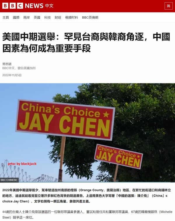 BBC報導美國橙縣選舉白熱化的現象,因現任共和黨眾議員也是韓裔的朴银珠不斷攻擊來自台灣的民主黨參選人陳介飛是共產主義的完美人選,但曾在美國海軍服役12年、其祖父、父母兄弟都在台灣的陳介飛還會被如此攻擊,也反映出台灣人移民美國後即將面對的災難:繼“中國行動計劃”(China Initiative)過去用“種族定性” (Racial Profiling) 起訴大量的華裔面孔後,台美人的災難也降臨了!