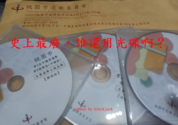 收到桃園選委會寄來的小包裹,內附三張光碟,係有聲選舉公報光碟,可能是要服務視障者,反正我們是第一次收到,但我電腦根本沒裝光碟機,而且我媽根本看不到選票也從不想投票,難道是要我推她坐輪椅到投票所,「我幫她投」?