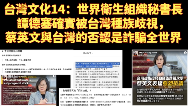 我說:閱讀下列報導與蔡英文擔任總統時期的發言,比對我之前提供的資料,請你說明台灣是否真的反對歧視?或是你認為台灣在「反對歧視」上到底做了什麼?蔡英文總統臉書親自回應世界衛生組織秘書長譚德塞指控如下:對於今天台灣被指控在國際社會上發動種族歧視攻擊的言論,我要表達強烈的抗議。…風傳媒報導如下: 遭譚德塞抹黑台灣「種族歧視」,蔡英文霸氣回應! 風生活綜合報導 2020-04-09
