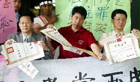 任務型國代昨天在陽明山中山樓開議,民主行動聯盟因不滿修憲案,當場撕毀當選證書,並表示辭去國代職務。記者張天雄/攝影2005/05/31 聯合報
