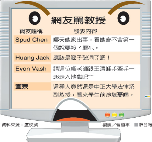 當然,諸如「得了迷戀罪犯症」、「希望她被強姦一百遍」等言論都不堪入目,發言的人應該明白「哪些話不該說」,但法律系副教授盧映潔用這種方式替這些網友「開課」,倒還是頭一遭。
