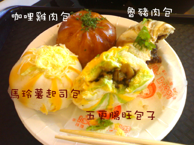 魯豬肉口味的包子,吃起來還好口味不會太過鹹.馬玲薯起司吃起來像是薯泥沙拉,最好吃的大概就是那個咖哩雞肉包,因為把他撕開的時候,偶地喵啊~他還有冒熱氣唷,包子要熱熱的吃才好吃,雖然店員是說東西都是現做,但是拿到嘴裡都快變成常溫,外面的熱空氣都比包子熱,咖哩雞肉的包子皮酥酥的,口感不錯.感覺起來包子皮吃起來的味道都一樣,只不過顏色不一樣
