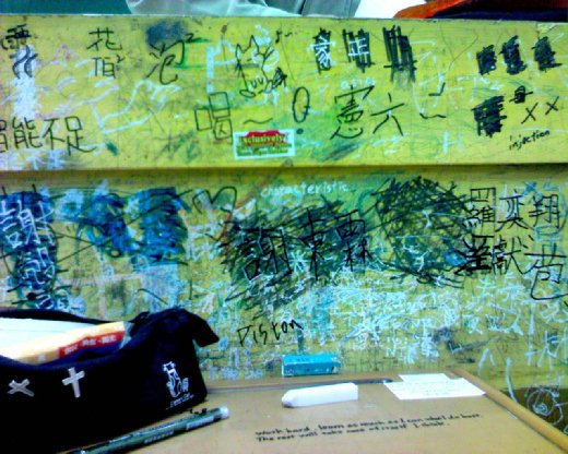 很幸運的坐在第一排的位子,剛好在講桌的前面,那個亂花花的講桌,空白的地方都被學生的塗鴉填滿了,真是懷念啊!是不是每個當學生的人,都一定會這樣,在每個可以用任何東西留下線索的地方,都會把他填滿,寫著別人的名字,有的是暗戀有的是不屑.