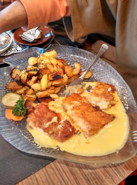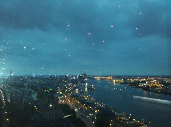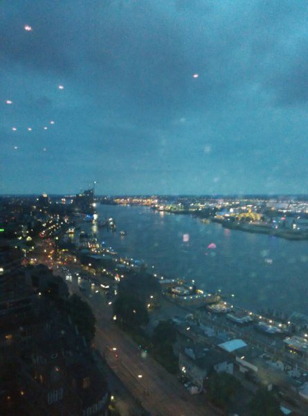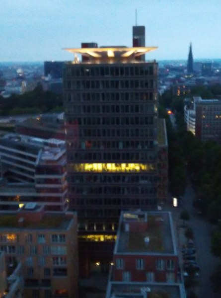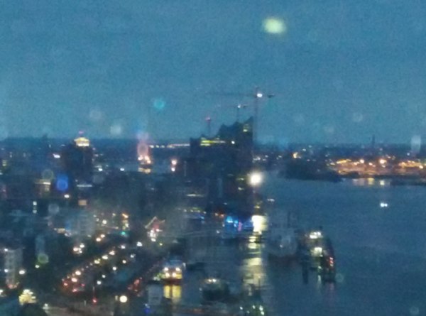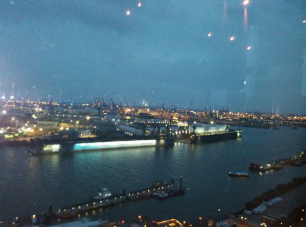 漢堡的比目魚有大、小比目魚之分,應該是種類不同,它的小比目魚就相當於台灣所謂的大比魚,且各式魚排種類多又新鮮,可惜烹調方式單調,穿著正式第一次走進高級酒店,價格也相對高級,整棟建築位於半山腰,20層樓高四周透明帷幕,整體VIEW沒話說,正好高處鳥瞰漢堡港,人潮眾多而且越晚越擁擠,熱門時段沒有提早定位肯定有錢還沒得花呢!啜飲美酒一邊俯視雨中港口,別有一番滋味,美中不足口袋不深無法儘興,餵飽酒蟲此地不宜