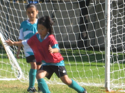 在經過一位熱情教練的嚴格調教, 再加上她老媽每每在一旁喊得嗓子都快啞了, 終於也打出一點名堂. 雖然從來沒有經歷過”臨門一腳”踢入球門得分的經驗, 可是我相信近十場的比賽下來, 她已經能粗略領會足球運動箇中苦與樂.