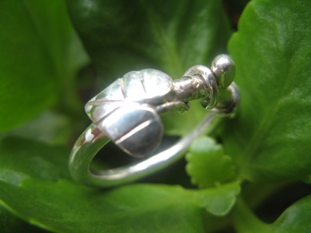 然後利用一塊剩餘的小銀片鋸成葉子 再將銀葉片放在凹槽內打成弧形 最後利用線鋸割出葉脈絡 再將較細的銀線與葉片焊接成一條藤蔓 隨後將藤蔓纏繞在單指環上 再將末端的銀線捲成藤鬚 一只花戒就完成了