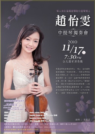 趙怡雯老師今年的中提琴獨奏會,其實我聽完去年的之後,就已收到她捎來的信息,後來看她今年在部落格寫出全名-【趙怡雯中提琴獨奏會:英美珠玉之作】,我心中就一直想:今年的曲目是不是有比較特別的呢?因此今年的這場獨奏會,我也就一直期待著。