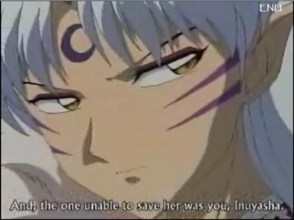 「你跟那個女人是什麼關係,我一點都不想知道!」「不過,殺死她的人是奈落,而眼睜睜看著她死,而沒有辦法救她的,是你,犬夜叉!」自這段對話以降,犬夜叉失去桔梗後的內心,在此時完全崩解,而說這段話的人,正是他【父親樣的哥哥】殺生丸。在我看來,這段對話有一個明顯的暗示:殺生丸還是很在意犬夜叉,並為犬夜叉沒能完善守護【心愛的女人】而發出指責的聲音。