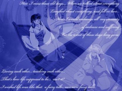 在我的記憶中,這首歌的播送,始於犬夜叉與殺生丸對話之後,手裡握著桔梗斷裂的長弓,深表悔恨、懊惱的情節。是故,雖然這首歌並沒有打出中譯,它卻仍貼切地描述了,犬夜叉對桔梗的一往情深,這當中所包含的畫面,也主要是犬夜叉跳下山崖,去尋找桔梗的蹤跡,而令我最震撼的,則是犬夜叉在遍尋不獲之後,那種激動的情緒表現。這種心情,或許只有當事人才能深切體會吧!