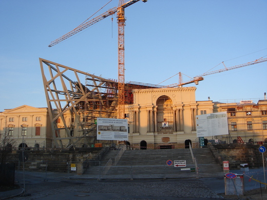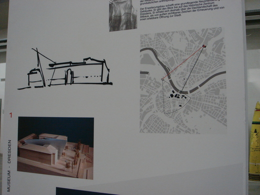 再來要介紹的是博物館的設計,當初看到之後不免又想,這位老兄又在玩什麼把戲,這種新舊結合的案子做來做去其實都差不多,不過這次這個”插”在舊建物裡面的巨大三角型真的是還滿醒目的,而它到底代表了什麼意思呢? 照片二裡有個很一目瞭然設計概念,不過說到這裡不懂的人還是不懂,為何除了主軸線之外會出現另外一個偏向西南方的軸線呢? 這我就不得不跳出來位大家解釋了,紅線直指的是一個橢圓形運動場,黑色的部份代表德勒斯登舊城裡最重要最美的那群建築物,當初盟軍在知道德勒斯登將被蘇聯佔領後,便沒血沒淚的派出了三趟轟炸機,盟軍以這個運動場為基準開始空炸,當轟炸機飛過這個點時就開始下彈,從西方飛過來往東南方轉一圈丟完炸彈後拍拍屁股回家。