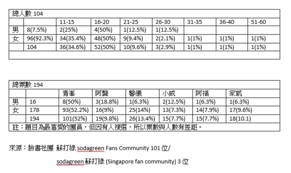因原本是想寫一篇關於蘇打綠的心得,所以做了一點小調查,雖然完成的篇時,方向已經不太一樣,但打粉熱情的回覆,我還是把他整理出來。詢問 打粉的性別、年紀層、最喜愛的團員。(兔姨、阿純有上榜,但數據分析尚未納入)