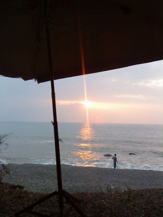 厚重的雲層中,太陽意外探出頭來,在海上拉起一道長長的光波。岸邊的這位男士,與兒子一前一後在沙灘上閒晃,時而看看老公甩竿,時而丟石頭嬉戲,然後不知何時,消失在我的視線中。