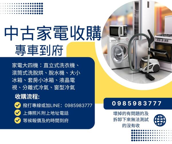 家中舊家電堆積不用,占空間又影響生活品質嗎?想換新電器卻不知道舊的該如何處理?別擔心!我們提供專業二手家電收購服務,用最合理的價格,替您解決煩惱,讓舊家電變成現金,環保又實惠。 🌟 我們的服務項目 ...