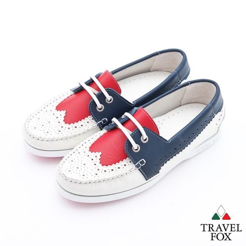 Travel Fox(女)英倫情牛津雕花三色牛皮帆船鞋 - 藍紅白大推
