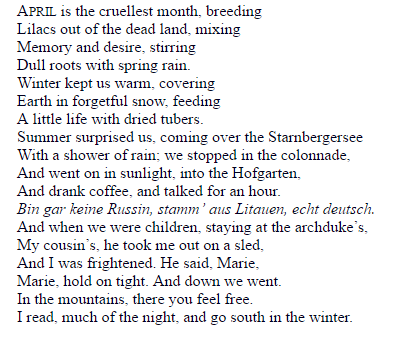 ''The Waste Land''- is a long poem by T. S. Eliot. It is widely regarded as one of the most important poems of the 20th century and a central text in Modernist poetry. Published in 1922, the 434-line poem first appeared in the United Kingdom in the October issue of The Criterion and in the United States in the November issue of The Dial. It was published in book form in December 1922. Among its famous phrases are "April is the cruellest month", "I will show you fear in a handful of dust", and the mantra in the Sanskrit language "Shantih shantih shantih".
