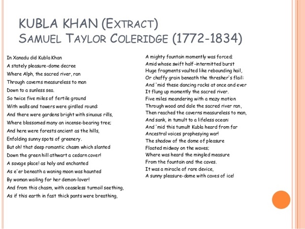 -is a poem written by Samuel Taylor Coleridge, completed in 1797 and published in 1816. According to Coleridge's Preface to "Kubla Khan", the poem was composed one night after he experienced an opium-influenced dream after reading a work describing Xanadu, the summer palace of the Mongol ruler and Emperor of China Kublai Khan. Upon waking, he set about writing lines of poetry that came to him from the dream until he was interrupted by a person from Porlock. The poem could not be completed according to its original 200–300 line plan as the interruption caused him to forget the lines. He left it unpublished and kept it for private readings for his friends until 1816 when, at the prompting of Lord Byron, it was published.