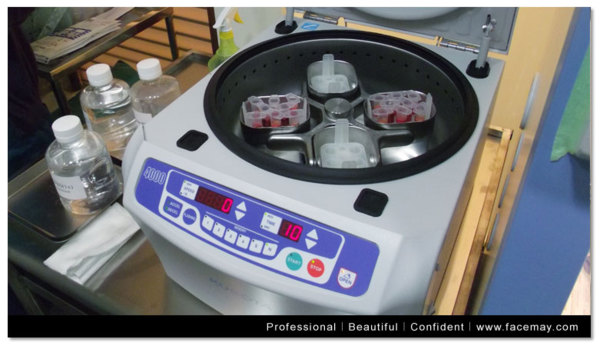 分裝完畢後,加入緩衝液並搖晃至均勻,搖晃均勻後我們將脂肪放入離心機,進行第一次離心作業。