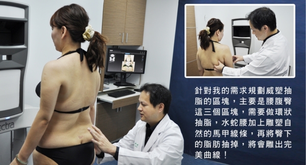 林孟羲醫師針對我的需求規劃威塑抽脂的區塊,他認為我的塑身計劃需分為兩階段進行,第一階段主要針對腹部腰部,第二階段再針對臀部大腿雕塑,因為以健康安全為考量,醫師不建議我同時進行全身的威塑抽脂手術。
