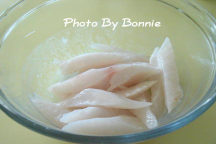 魚肉切粗條,用適量太白粉和少許橄欖油拌勻。