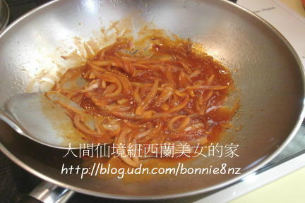 再加入水、辣椒醬、蕃茄醬、蠔油、糖,