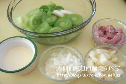 雞肉切條,洋蔥切碎,馬鈴薯切丁。