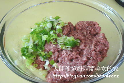 牛絞肉加鹽、酒、太白粉、香油、胡椒粉,拌勻醃30分鐘。加蔥花攪拌至黏性,再加入切碎的芹菜,即為餡料。